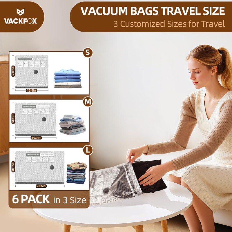 - 6 Pack Vacuum Storage Bags: Provide 3 different sizes of compression bags, 2 Small:15.8"X15.8"(40*40cm); 2 Medium:15.8"X19.7"(40*50cm) ; 2 Large 15.8"X23.6"(40*60cm), covering all your storage needs. Whether it’s for blanket storage or securing seasonal attire, our assortment ensures everything from bulky outerwear to delicate garments is protected and organized, proving indispensable for both home use and as travel vacuum bags.