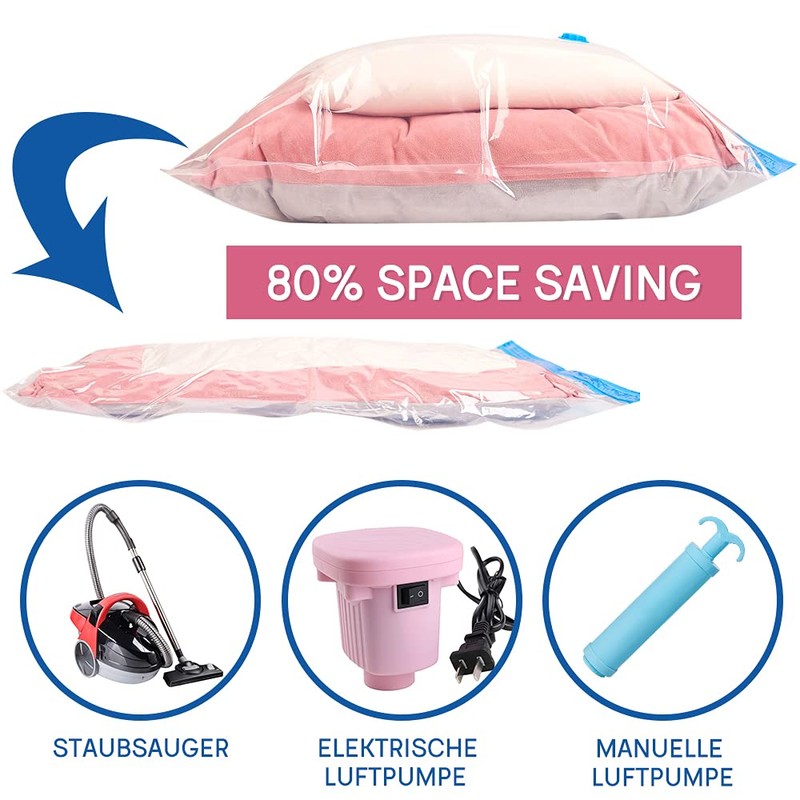 - SAVE SPACE Use a vacuum bag to save more than 80% space. You can put more clothes, duvets or other items in the closet, suitcase or under the bed than before. The transparent vacuum bag helps you quickly find what you need