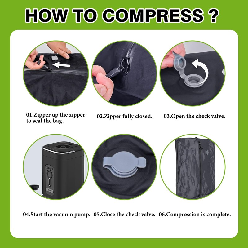 - 【Mini Dual-Function Vacuum Pump】:Included is a compact, cordless pump that compresses or inflates — suction from the base, inflation from the side. Remove the gasket for inflating; add spacers for compression. Weighing just a few ounces, it’s perfect for carry-ons. Built-in travel lock avoids accidental startup: press and hold for 3 seconds to unlock, wait for four blue light flashes, then tap to activate.