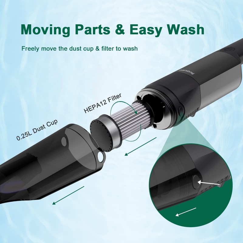• Washable & Reusable Filters - The hand held vacuum are designed with dust containers that meet high Efficiency particulate air (HEPA) standards. It's easy to assemble and disassemble, easy to clean.