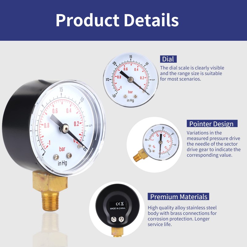 - Professional Design This is a professional pressure gauge for testing the pressure of different liquids. It is a practical industrial tool and a perfect pressure gauge for household and industry.