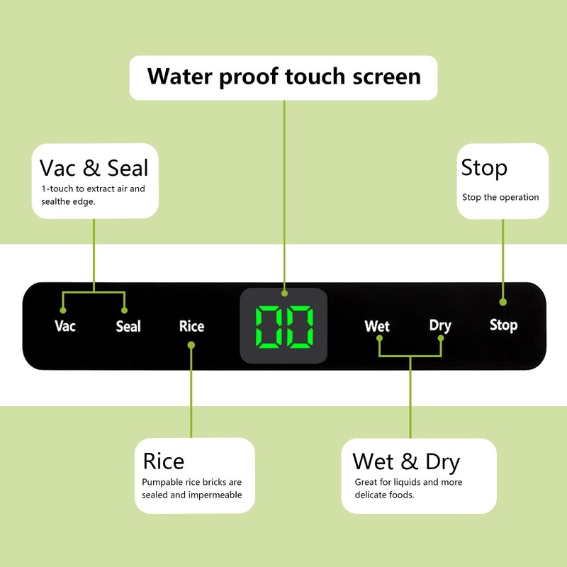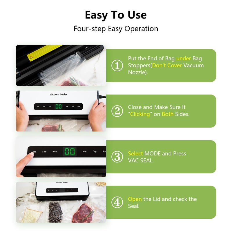 - Effortless One-Touch Automation: Maximize convenience with our food vacuum sealer machine's One-TouchAutomatic Mode, This feature ensures a lightning-fast, hands-free sealing process-ideal for busy households. Reduce food waste, so you can say goodbye to wasting time and extend food freshness