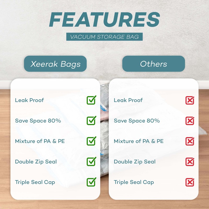 - 🟢[DOUBLE ZIP SEAL, CLIP & TRIPLE SEAL ANTI LEAK VALVE] - Double Sealing Zips ensures that the bags are airtight and watertight. Stay-on Clip enables smooth zipping and unzipping. Triple Seal Turbo Anti Leak Valve allows the air to be vacuumed out faster and ensure every ounce of Air to be Extracted Out of the vaccumm-bag in suction process.