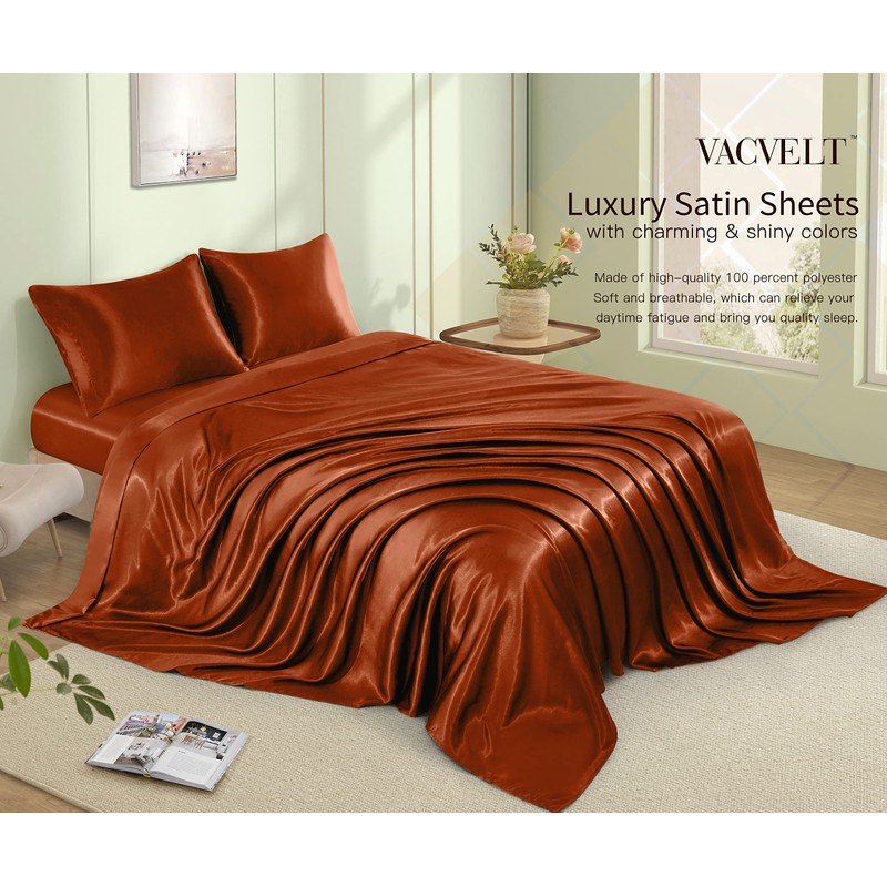 VACVELT 4pcs Rust Orange Satin Sheets Queen Size Bed Set, 15 Inch Deep Pocket Silky Satin Sheet Set, Soft Satin Bedding Set Cooling & Luxury Bed Sheets, 1 Fitted Sheet + 1 Flat Sheet + 2 Pillowcases