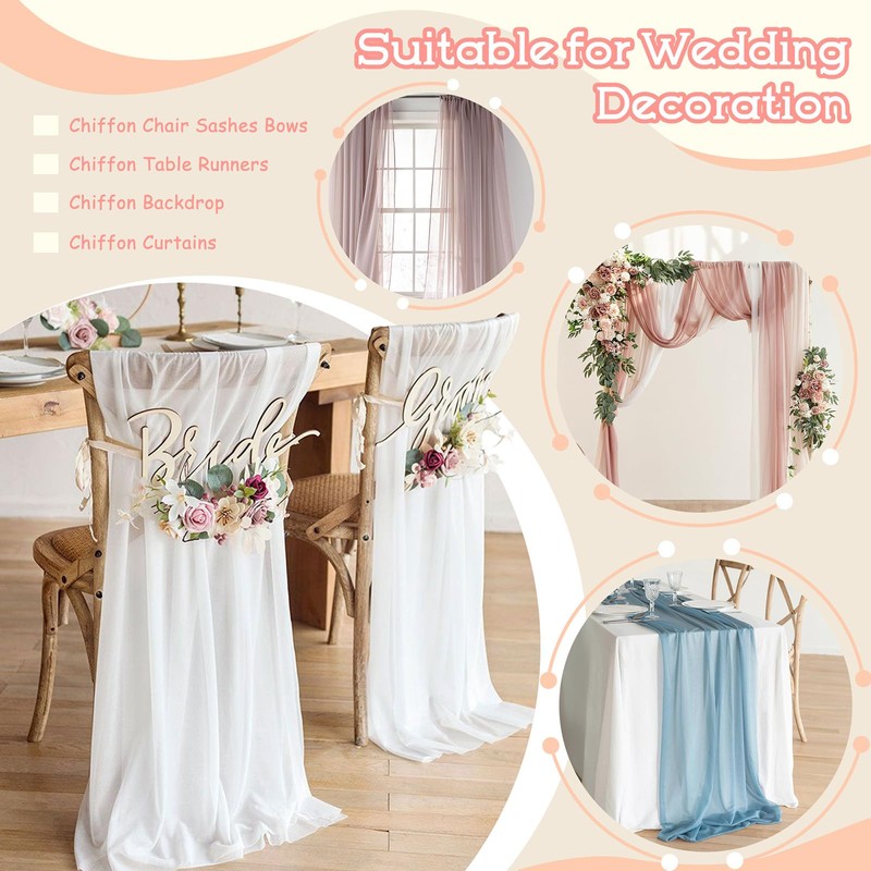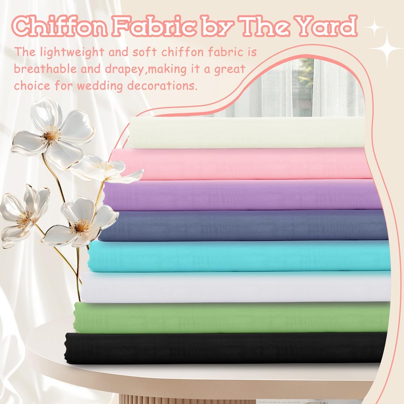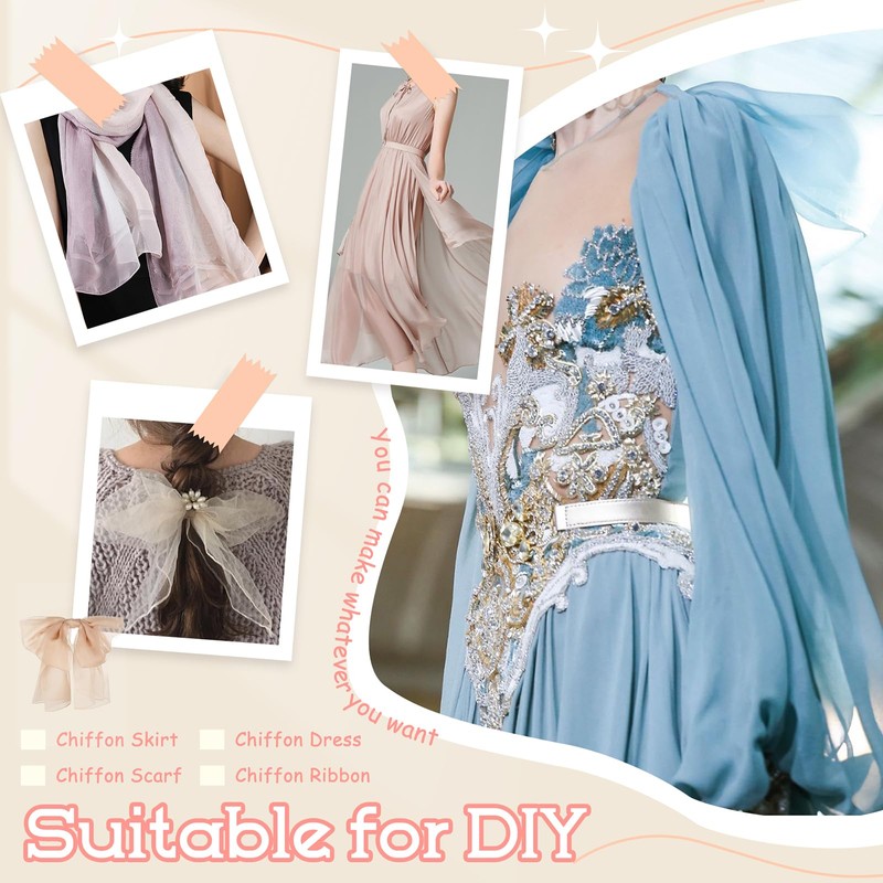 - WIDE APPLICATION RANGE: The sheer chiffon fabric is breathable and drapes well. You can use it to make table decorations such as chiffon table runners, chiffon tablecloths, chiffon chair sashes. It can also be used to make chiffon dress, chiffon blouse, chiffon scarf, chiffon skirt, chiffon wrap, chiffon hijab, chiffon shawl, chiffon gown.