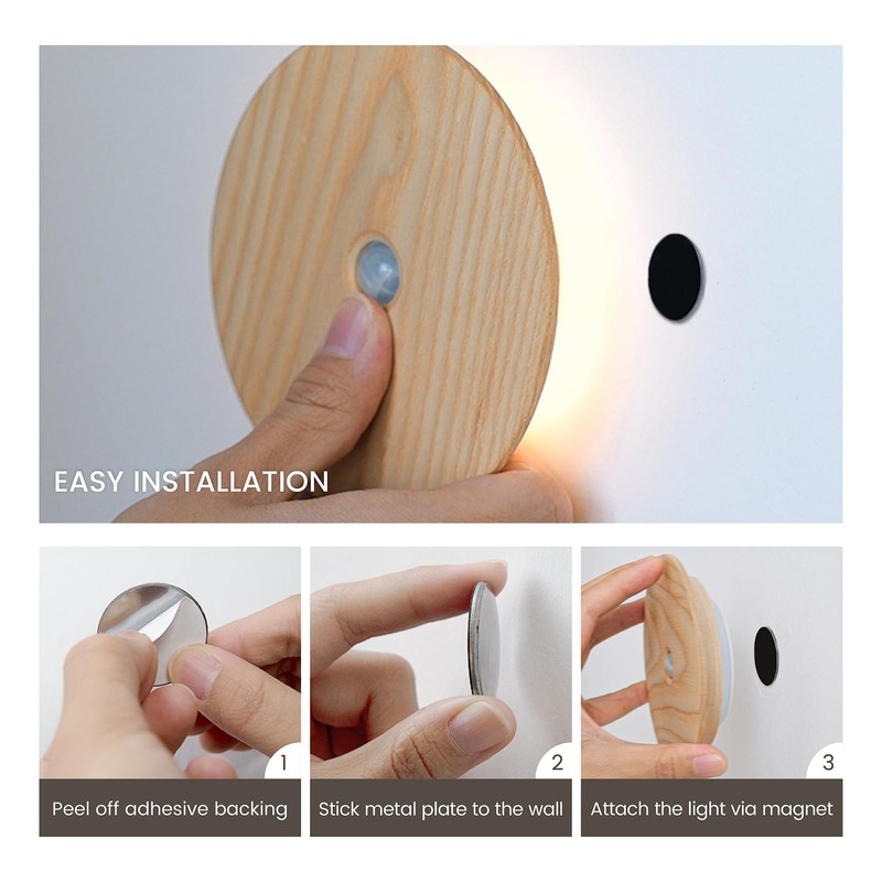 Stick the adhesive metal sheet on the Non-metal Surface,then stick the led wall mounted night lights on the metal sheet.