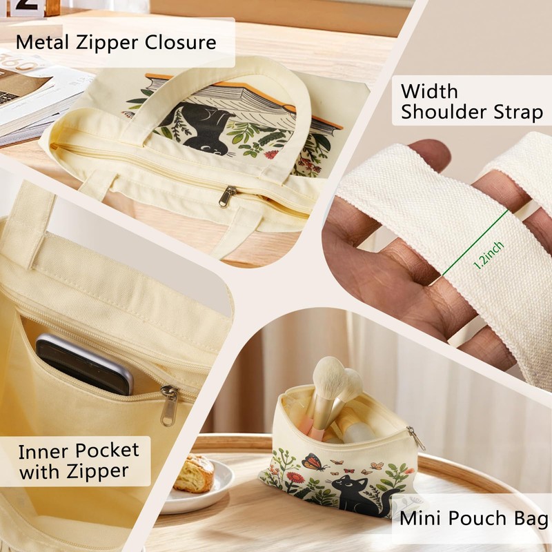 - [Canvas Tote Bag with Zipper] – This canvas tote bag is equipped with a metal zipper. The zipper of the main compartment prevents spills and provides anti-theft protection. The small inner zippered pocket safeguards your items privacy. The attached small zippered pouch helps organize daily essentials, keeping the canvas bag tidy for easy access