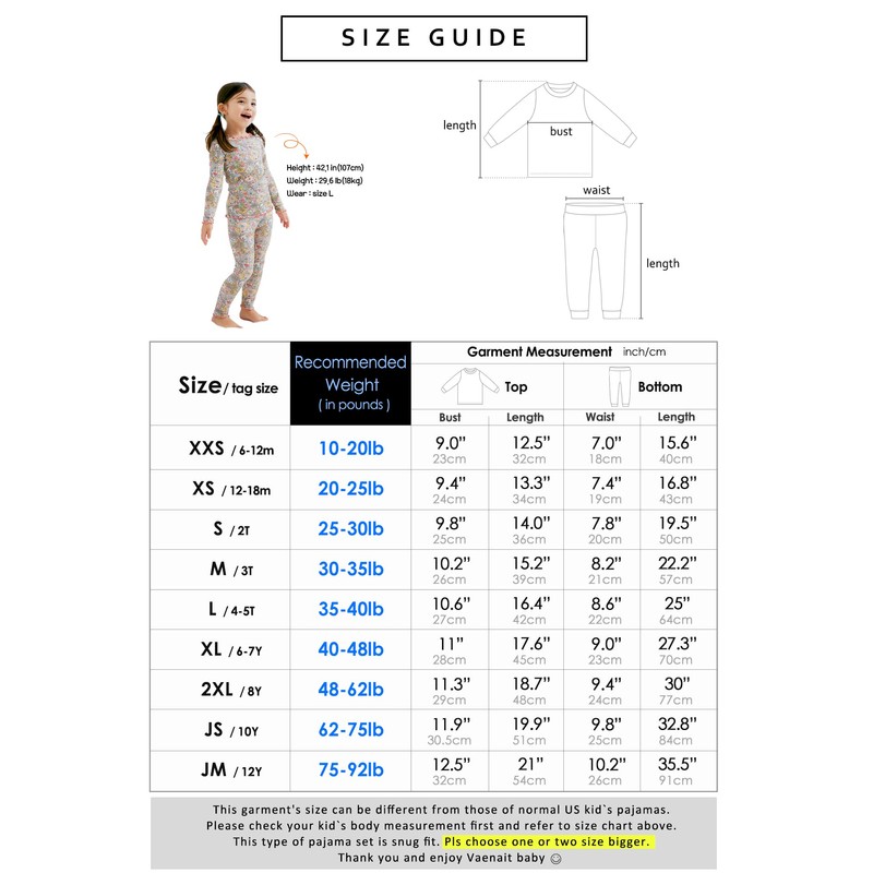 • For child's safety, cotton sleep sets should always fit snugly. Loose fitting garment is more likely to catch fire. All of Vaenait Baby's products are strictly under Consumer Product Safety Rules.
