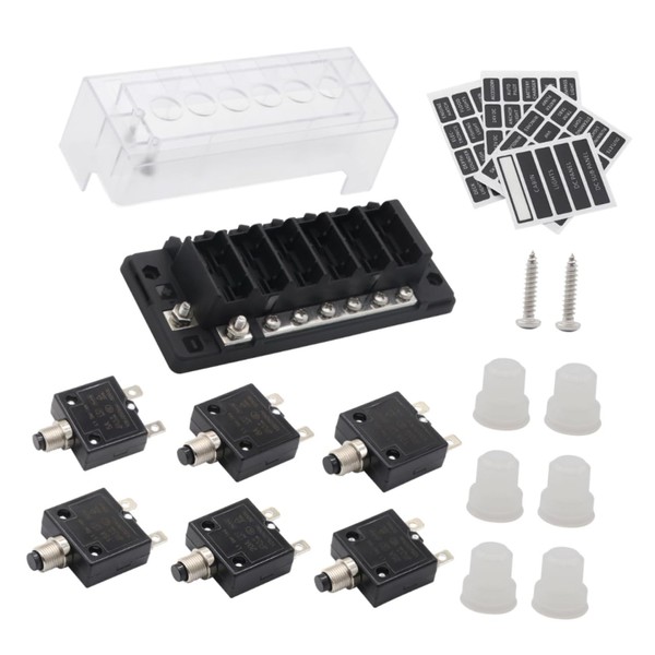 1 x circuit breaker overload protection box 6 x transparent caps 4 x stickers 2 x screws 1 x 5A overload protector 1 x 8A overload protector 1 x 10A overload protector 1 x 18A overload protector 1 x 20A overload protector 1 x 25A overload protector