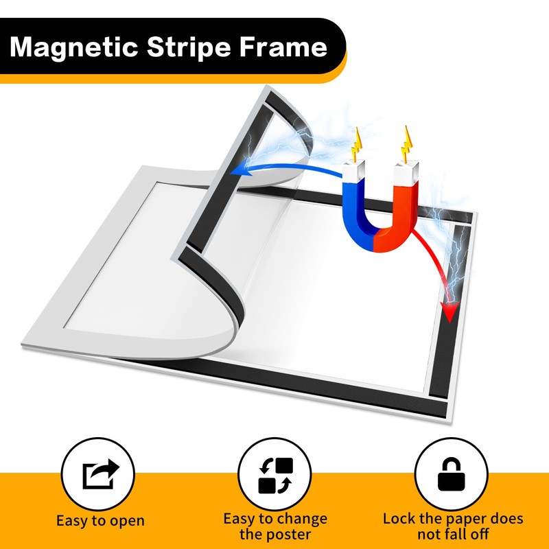 2、Magnetic Strip Frame: easy to open for quick poster changes.