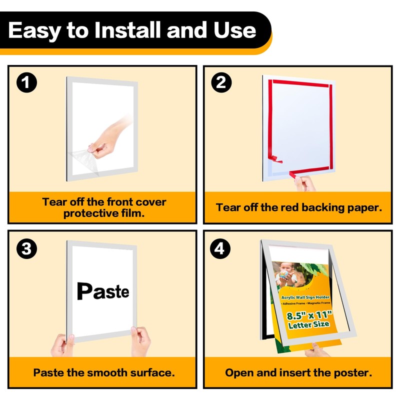 - Easy Installation: Simply peel off the clear film and backing paper, adhere the magnetic frame to a smooth surface, open the front cover and insert the poster