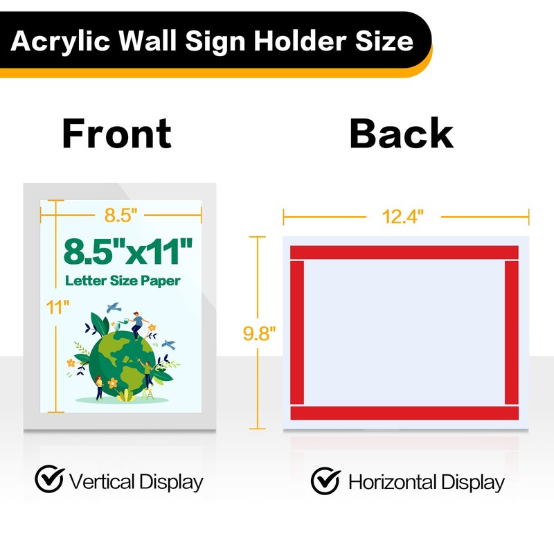 - 8.5"x11" Acrylic Wall Sign Holder: Versatile magnetic frame for displaying posters horizontally or vertically, easily replaceable, peel and stick installation without drilling
