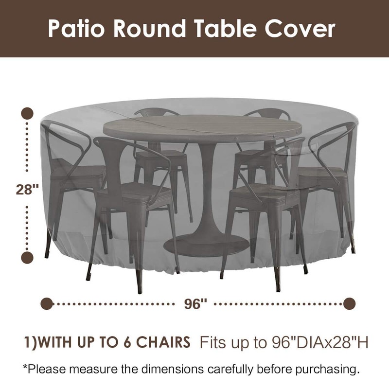 - Size: 96"DIAx28"H. Fits 80, 84 inches diam round patio tables or fits including but not limited to 48,52,54,55,60,62,64,68,70,72,76,84 inches table chairs set.Note: The coverage depends on the size of the furniture set, especially the depth of the chairs. Please measure the dimensions of your furniture carefully before purchasing.