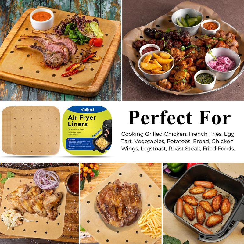 Vailnd Air Fryer Liners Disposable, 100pcs 8.5In Square Parchment Paper Sheets Unbleached, Perforated Food Steamer Liner for 5-8 Qt Air Fryers Baking Cooking Oven