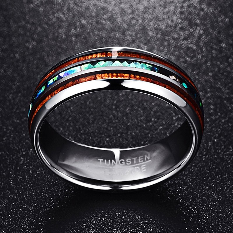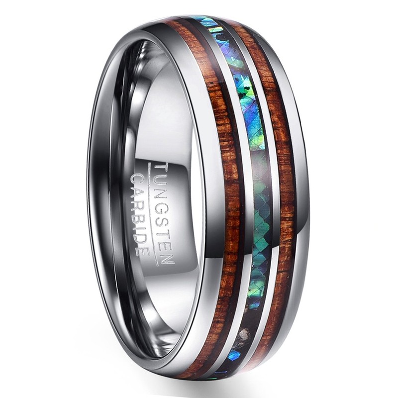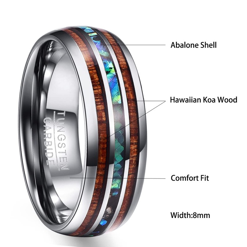 Hawaiian koa wood and Abalone shell Inlay, this ring is engraved with tungsten carbide on the inside, a one-of-a-kind design that's perfect for your everyday wear.