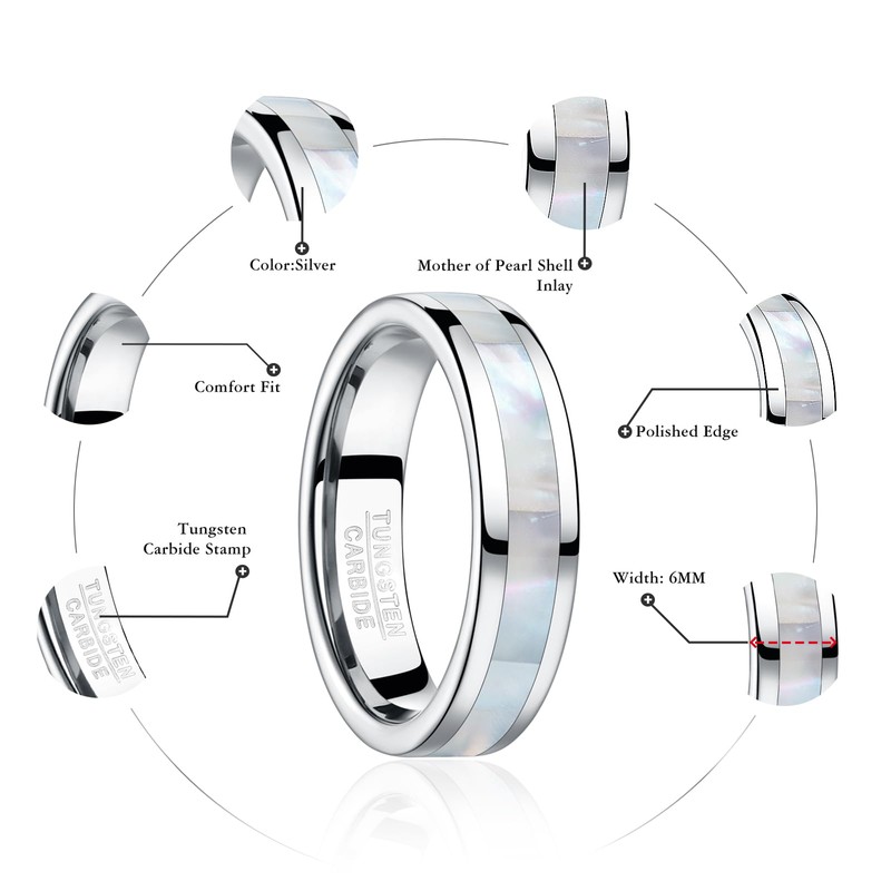 This 6mm tungsten wedding ring is designed in Mother of Pearl Shell & polished edge domed.