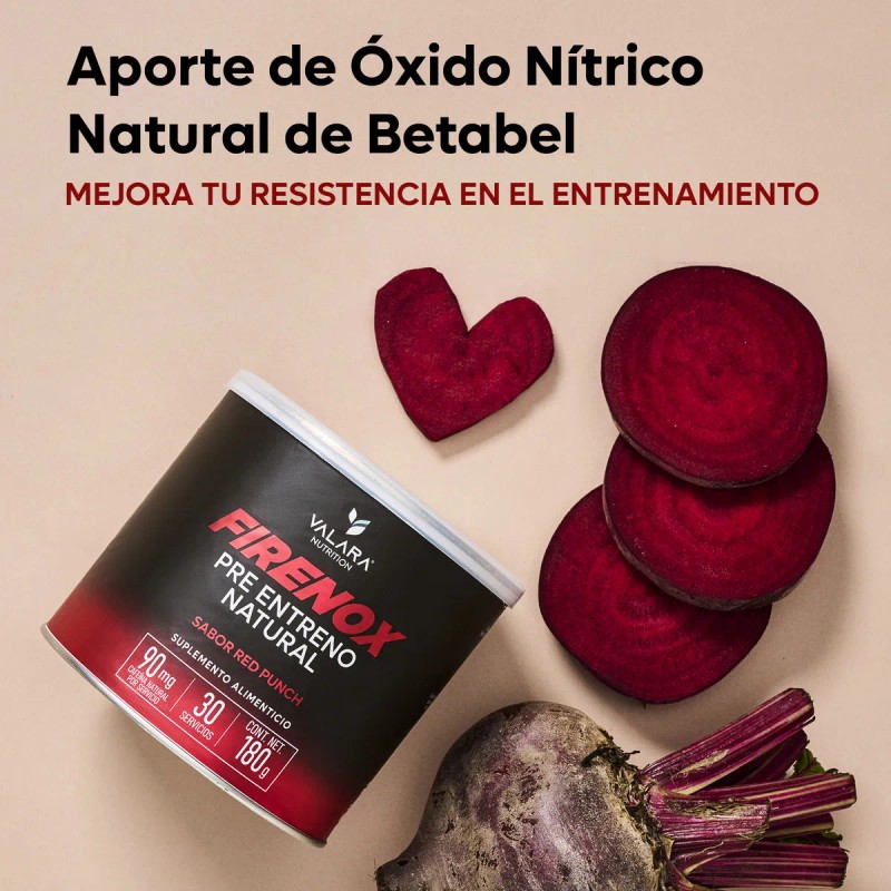 ## Beneficios Clave de VALARA Firenox Red Punch: * ⚡ **Energía Natural y Sostenida:** Derivado del betabel para un impulso limpio. * 💪 **Mejora el Rendimiento:** Beta Alanina para un entrenamiento más intenso. * 🥤 **Fácil de Preparar:** Polvo soluble para un consumo rápido. * 🍎 **Sabor Delicioso:** Red Punch para disfrutar cada servicio. * 🌱 **Suplemento Natural:** Apoya un estilo de vida activo y saludable. * 💯 **30 Servicios:** Suministro práctico para un mes.