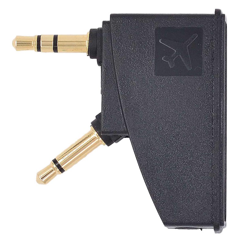 • Simply plug the headphones cord into the adapter and insert it into the airline jacks, then enjoy powerful, balanced sound for music or movies on the plane ride.