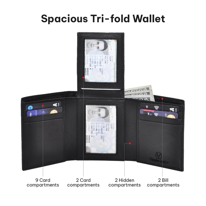 • Rfid Wallet For Men: Our Rfid trifold wallet for men features advanced proprietary blocking material, shielding you from electronic pickpocketing by preventing unauthorized scans from Rfid scanners. This executive wallet utilizes Rfid blocking technology, which completely encases and safeguards your valuable personal data.