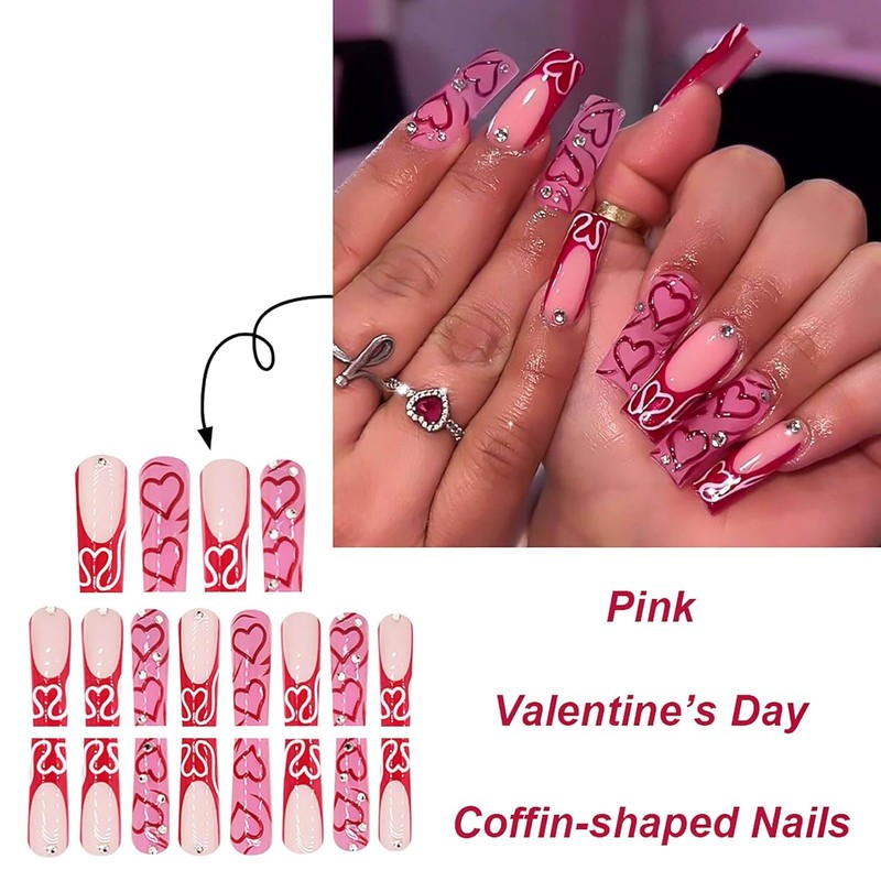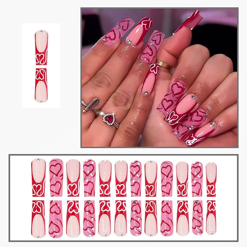 Valentine Pink Press on Nails Long Square Fake Nails French Tip False Nails with Heart Designs Sparkly Artificial Nails Valentine Day Glue on Nails Cute Stick on Nails for Women 24Pcs