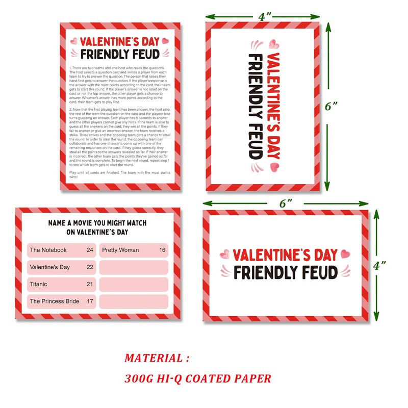 - Included in your purchase - Full rules explanation, 12 feud question cards, 3 quick fire final rounds, 4 team scoreboards. All cards have Valentine's Day themed designs on the back.