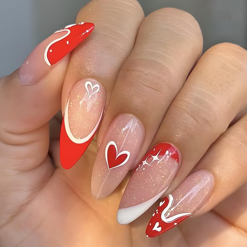 Valentine's Day Press on Nails Almond Medium Fake Nails with Red Heart Glitter False Nails French Design Full Cover Stick on Nails Artificial Nails Glue on Nails for Women Nails Decorations 24Pcs