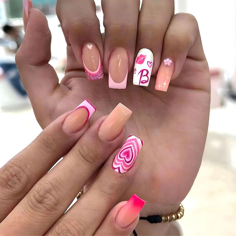 - 【Valentines Glue on Nails Kit】:There are 24pcs of square peach heart lips french design fake nails 12 different sizes,1 mini nail file, 1 small wooden stick, 1 nail sticker in the package. (Durability of jelly glue is not as good as liquid glue, but it makes fake nails reusable. Please use suitable glue according to different scenes).