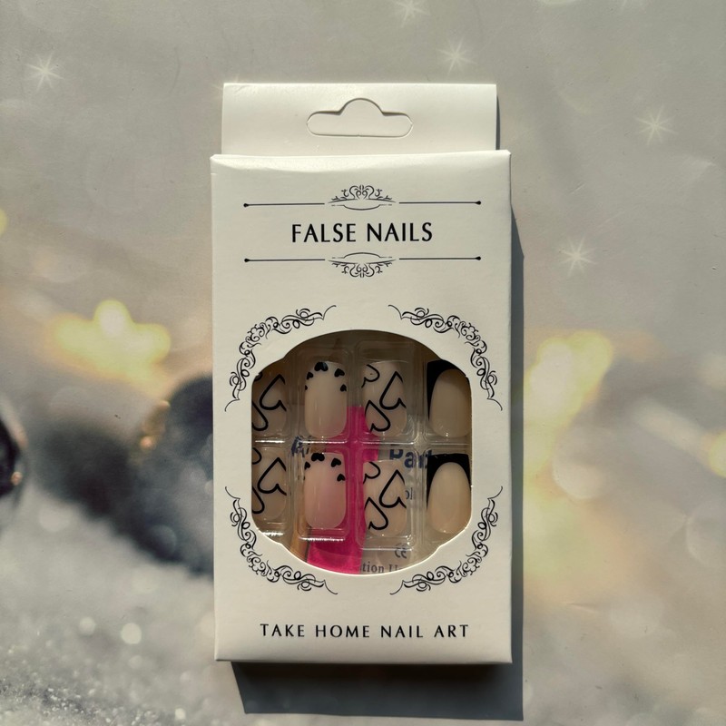 Valentine's Day Press on Nails Medium Square Fake Nails French Tip False Nails with Black Heart Tip Designs Heart Glue on Nails Nude Stick on Nails Cute Acrylic Nails Full Cover Glossy Artificial Nail