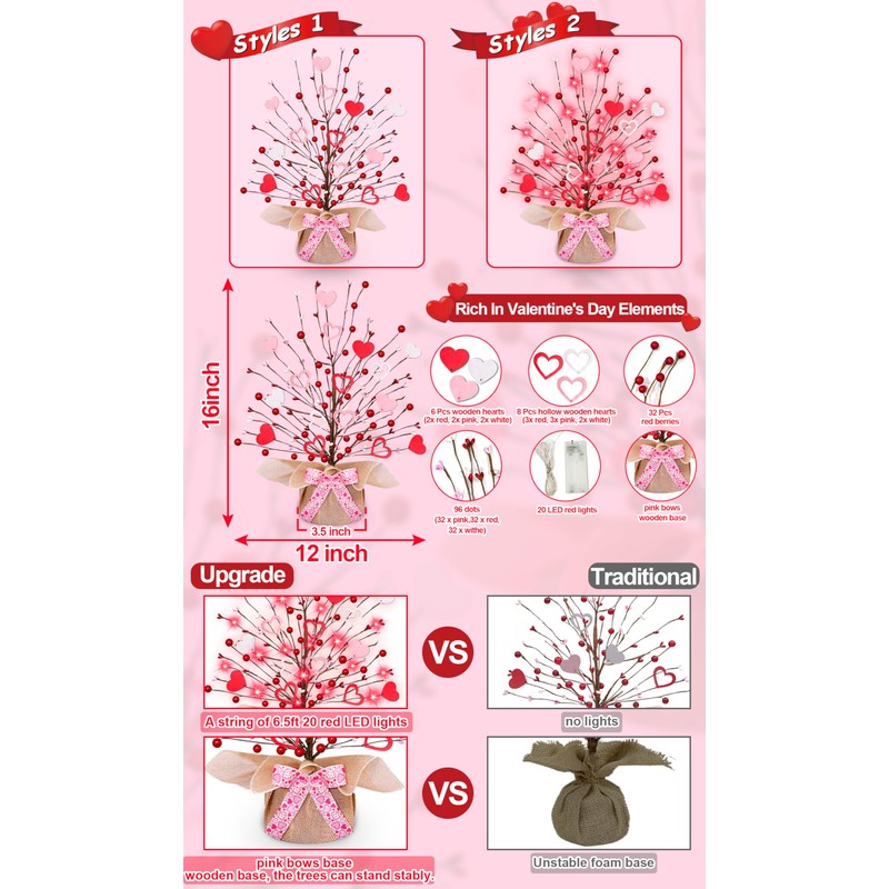 - 16 Inch Valentine's Day Tabletop Tree: Package include a 16*12 inch (H*W) tabletop tree with a burlap-wrapped wooden base measuring2*3.5 inch (H*W),The tree is adorned with an abundance of heart and pink berry decorations