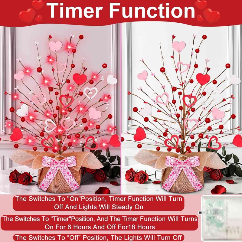 Valentine's Day Tree Tabletop Decorations 20 Red Lights with Timer Battery Operated 16 Inch 14 Red Pink White Heart 32 Red Berries Valentines Decorations Home Table Bedroom Indoor Party Wedding Decor
