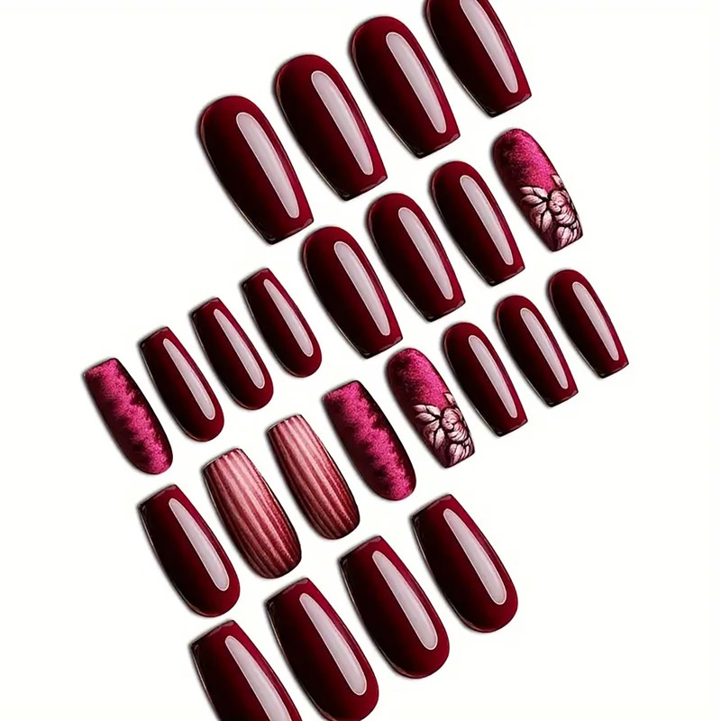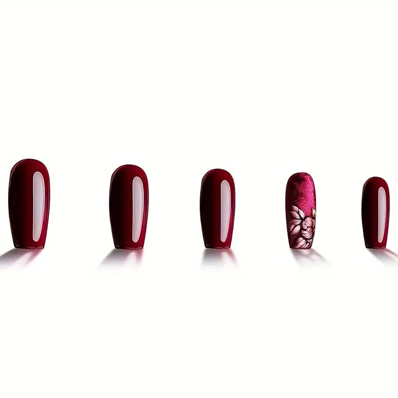 Valentine’s Wine Red Press on Nails Medium Square Fake Nails with Unique Floral Design Reusable Flower Acrylic Nails Full Cover Glossy Stick on Nails for Women Valentines Day Date Party Nail Art 24Pcs