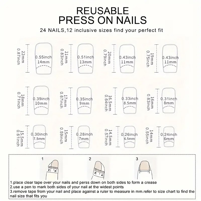 - 【Package Contents】24Pcs Press on Nails +1 Nail File + 24Pcs Jelly Glue Stickers+1 Alcohol Cotton+1 Wooden Stick.No matter the size or width of your nails, you can choose the most suitable false nails for yourself.(Durability of jelly glue is not as good as liquid glue, but it makes fake nails reusable. Please use suitable glue according to different scenes)