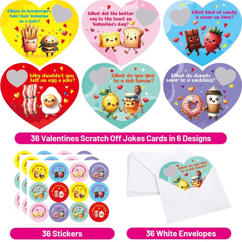 - Package Includes: 36 Valentines scratch off jokes cards in 6 designs with envelopes and stickers