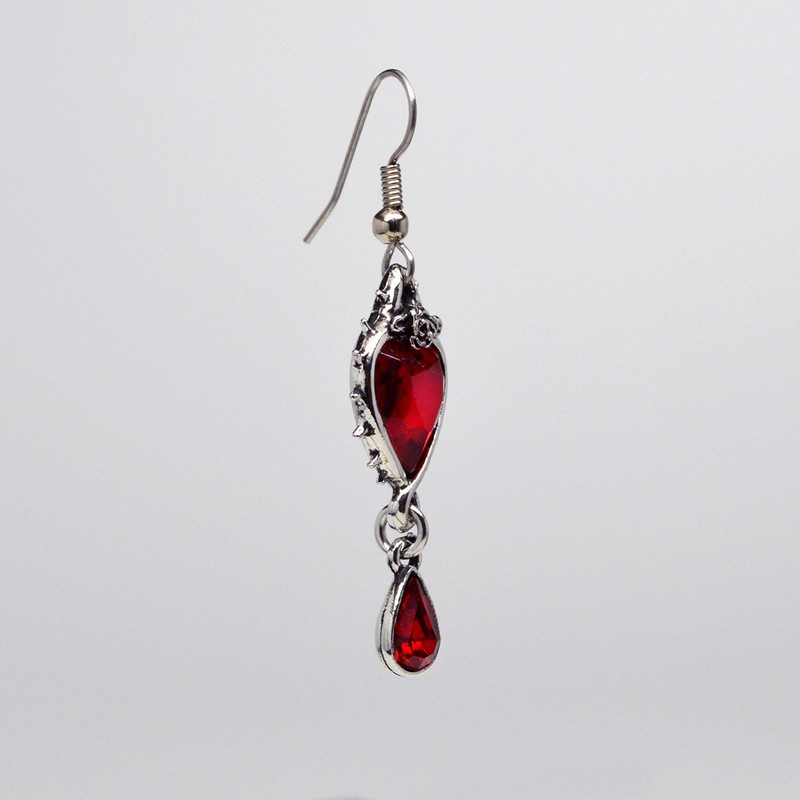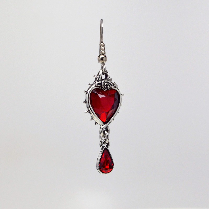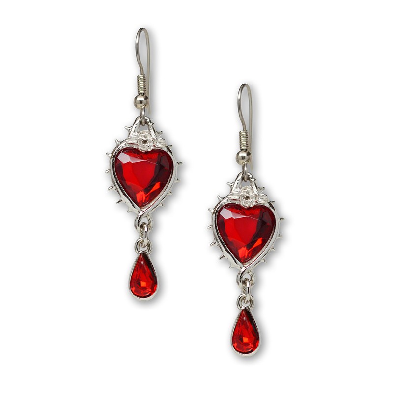 Valentines' Day Red Heart Romance Dangle Earrings Austrian Crystals Thorns and Roses Silver Finish