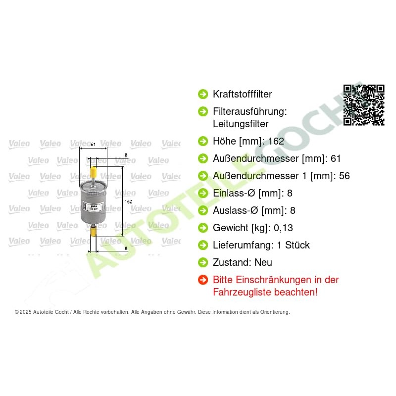 - Dimensions (mm): height: 162, outer diameter: 61, inner diameter: filter dirt and rust particles from the fuel and do not allow them to enter the engine and cause damage
