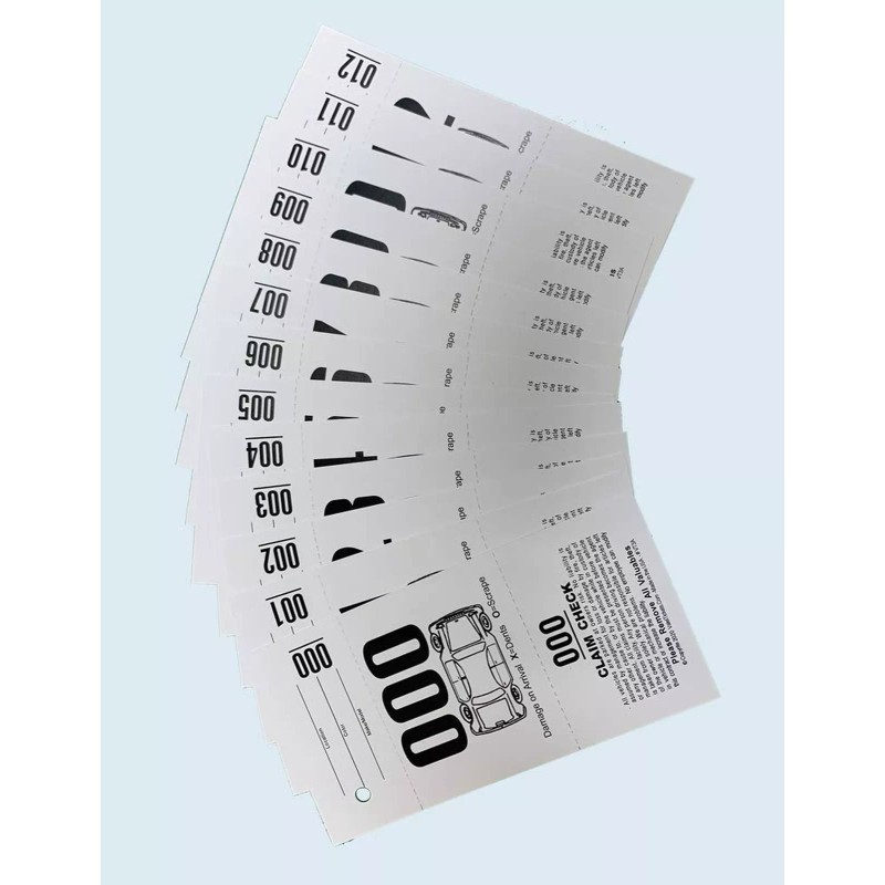 3-Part Valet Parking Tickets are printed on 110 lbs. Heavy Index Stock. These 3-Part Valet tickets are a standard in the industry and one of our most popular items. Our 3-part Tags are in stock and ready to Ship. The Top stub is for the Keys. The Middle Stub stays in the Car. The Third Stub Is the Claim that goes to the customer. ITEM VT3A Features of this product include: Overall Size: 2.83″ wide x 5.5″ long. Each 1,000 3- Part Valet Parking Tickets Numbered 000-999, Black Print on one Side of 110 lb. stock 2 Perforation and 3 Numbers Car Damage Diagram Sold in units of 1,000 tickets Claim Check Reads: All vehicles are parked at owner’s risk. No liability is assumed by management for loss or damage by fire, theft, or any other cause to, or by the vehicle while in custody of management. All claims must be presented before vehicle is taken from facility. Any person driving becomes the agent of the owner solely. We are not responsible for articles left in vehicle or mechanical problems. No employee can modify this contract or increase the liability Please Remove All Valuables Top Stub of the 3-Part Tags has a hole for the key ring and three lines to fill in the vehicle information. Example:Make, Model, Color, Location… Second Stub has a Large Number and should be placed inside the Vehicle on the dashboard so that you can view it through the windshield. Third stub is the claim check and should be given to the customer when they arrive.