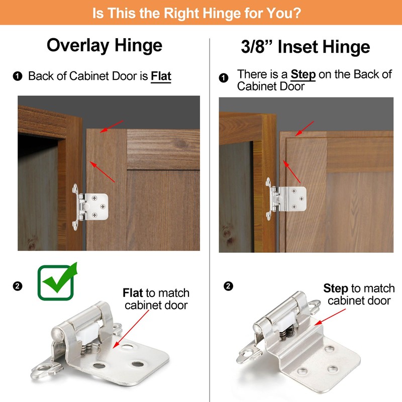 • Overlay Hinges: The hinges are for face frame cabinet. And, only work for flush mount cabinet doors.