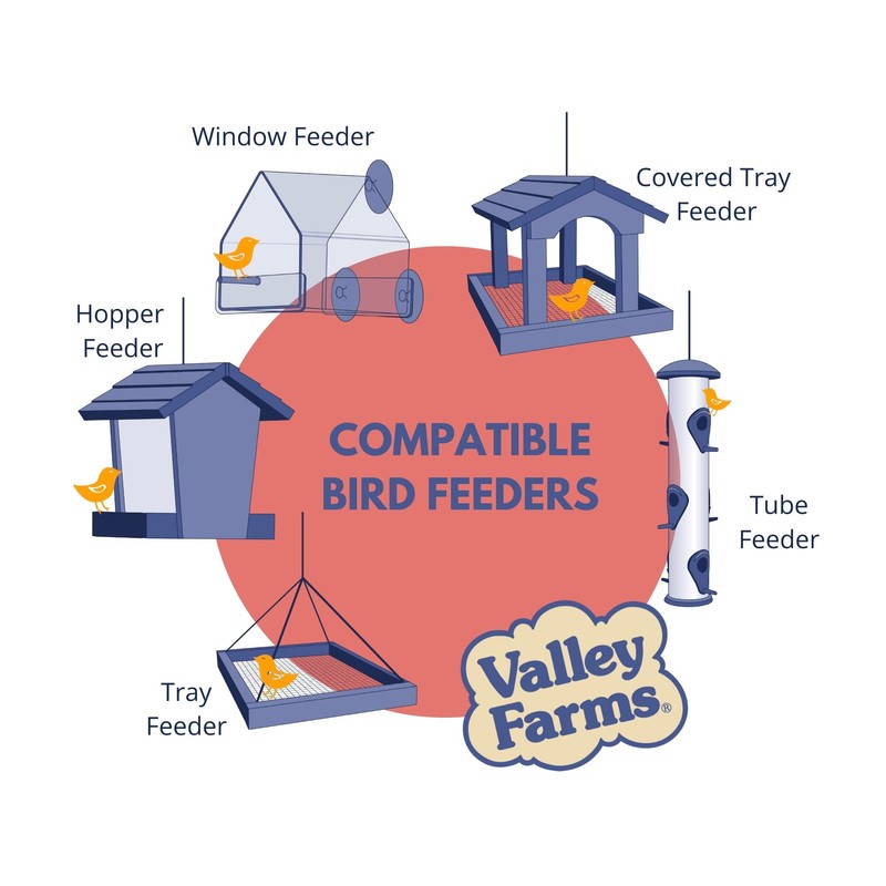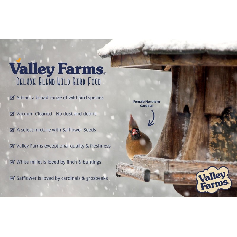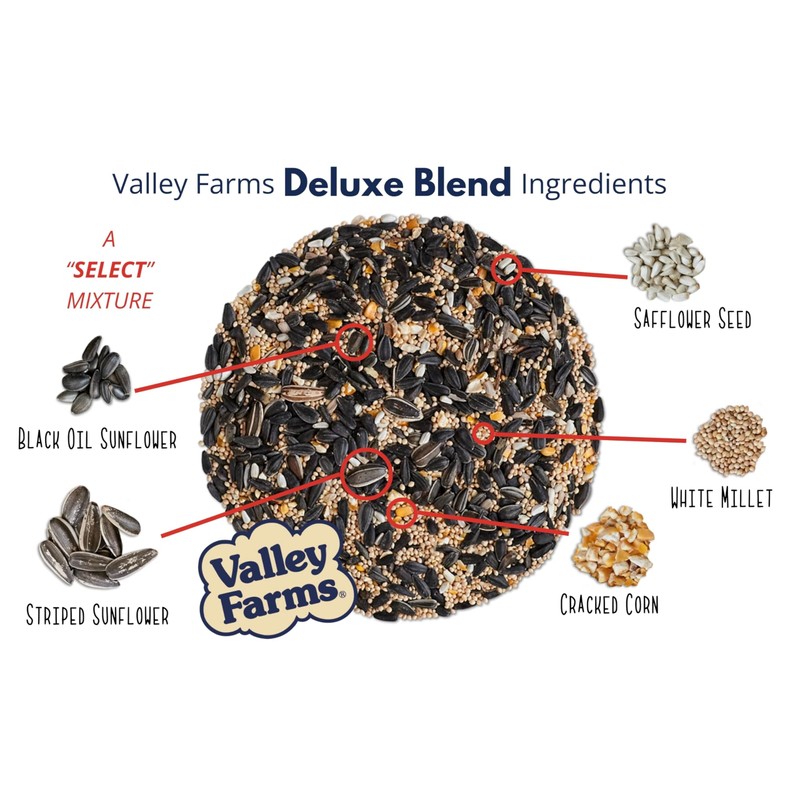 - 🐤 Valley Farms Deluxe blend wild bird food is always vacuum cleaned and filled with fresh sustainably sourced seeds - A premium blend at an unbeatable price.