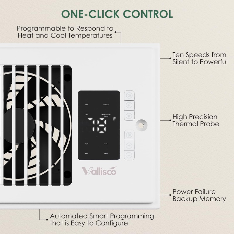 VallisCo Register Booster Fan 4"x10", 10-Speed Quiet Vent Fan with Negative Ion, Thermostat & Remote, Enhances and Improves Heating & Cooling Efficiency, Air Vent Booster for Home Room Comfort, White