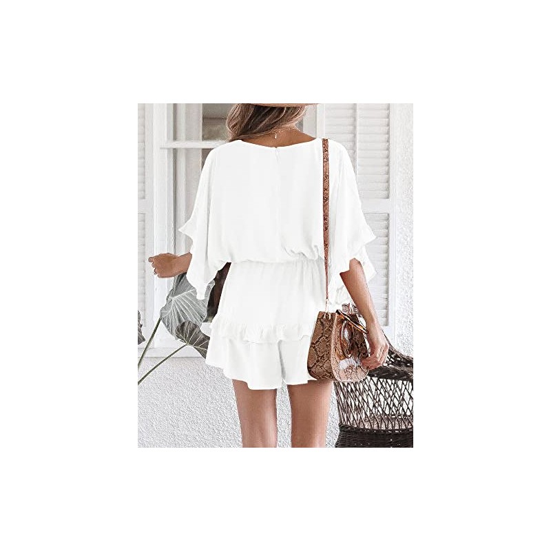 Valphsio Womens V Neck Beach Romper Ruffle Layered Drawstring Waisted Shorts Solid Jumpsuit