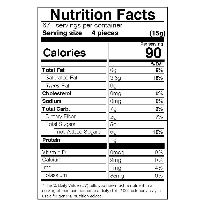 - Ingredients: cocoa beans, sugar, cocoa butter, sunflower lecithin (an emulsifier), natural vanilla extract