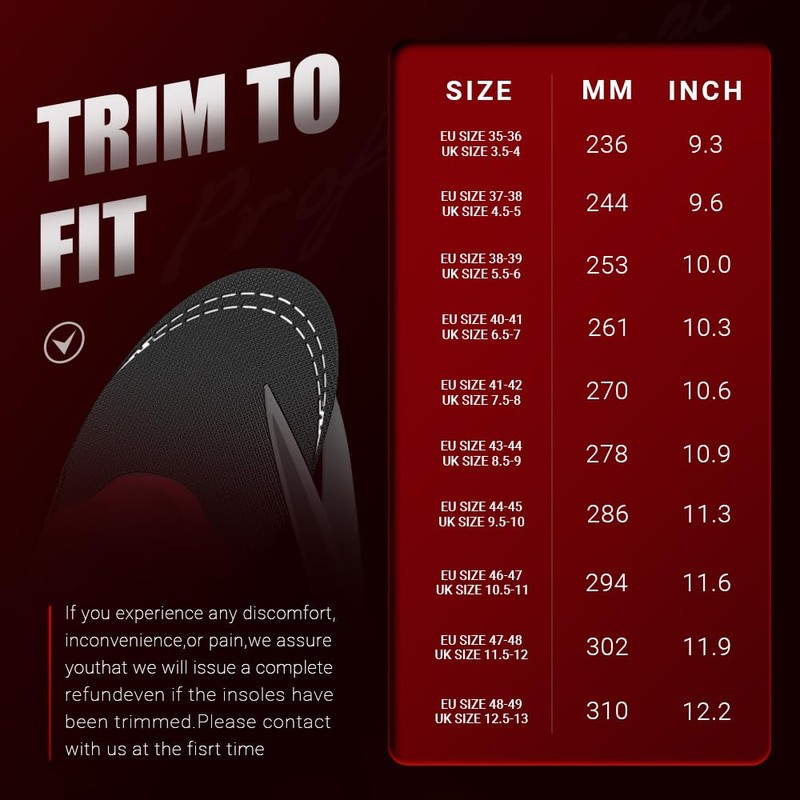 • 【Universal Fit, Cut to Size】The corrective insoles are suitable for all arch types: flat, midfoot, and high arches. The length can be individually cut to fit most shoe types, including walking shoes, running shoes, athletic shoes, work shoes, boots, hiking boots, and more. Whether for daily commuting or hiking, they are easily manageable.