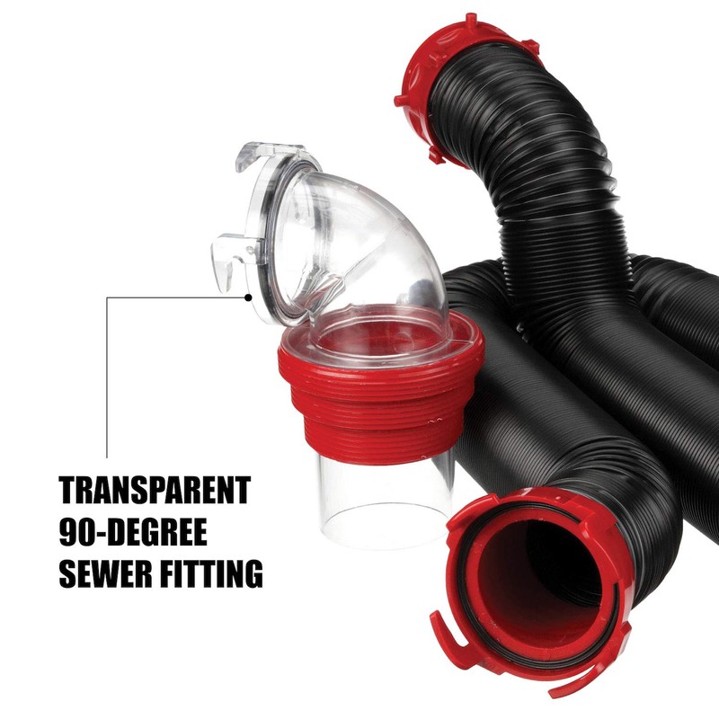 - CAMPER SEWER HOSE KIT: The Dominator hose kit includes one collapsible 15-foot hoses with rotating fittings plus a 90 degree universal sewer adapter and 2 drip caps