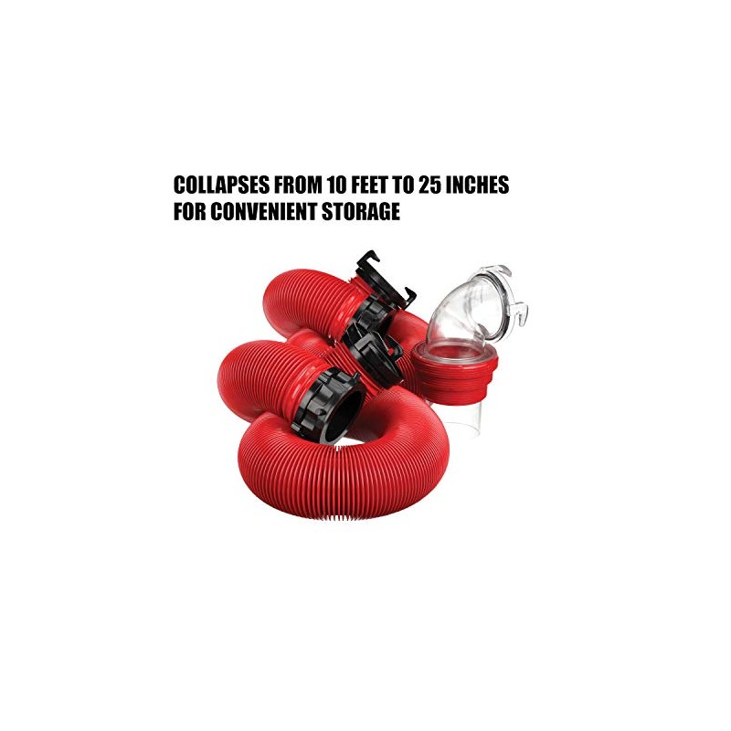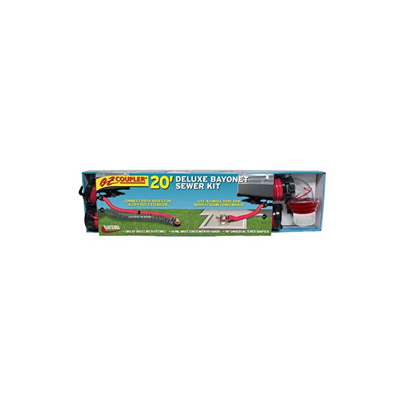 • Camper sewer hose kit: The EZ Coupler hose kit includes 2 collapsible 10-foot hoses with rotating fittings plus a 90 degree sewer adapter
