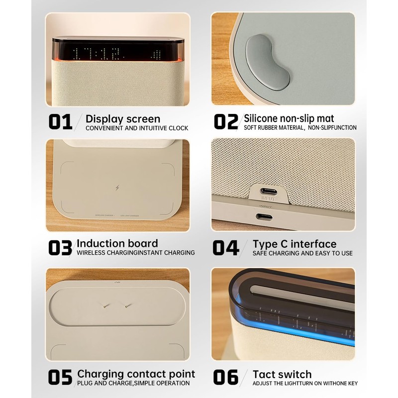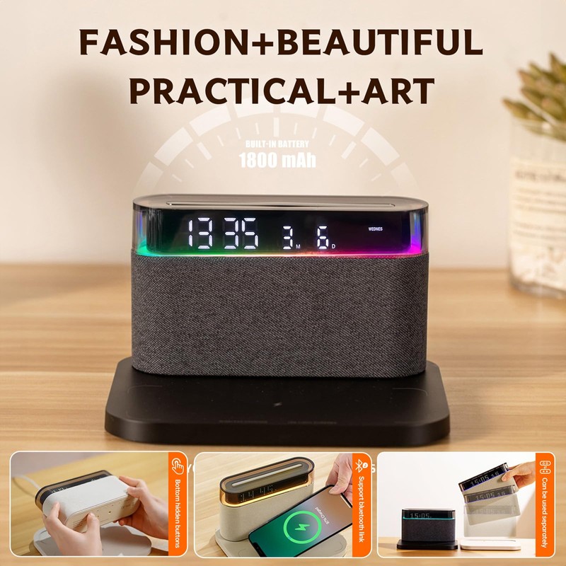 - 【Versatile Separable Design】 Our product can be used independently in two parts, each equipped with a separate Type-C charging port. The upper part combines the functions of a clock, alarm, night light, and speaker, while the lower part is a 15W wireless charging pad. Simply place your wireless charging-enabled devices on the surface for quick charging. We also provide you with an original charging adapter and cable, so you don't have to use the power cable of your other products.