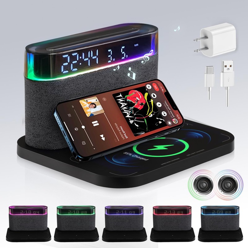VALUEAGLE Bluetooth Alarm Clock with Wireless Charging,6-in-1 Alarm Clocks for bedrooms Alarm Clock Bluetooth Speaker Wireless Charging, 3 Level Brightness&Colorful Light,Snooze(Black)