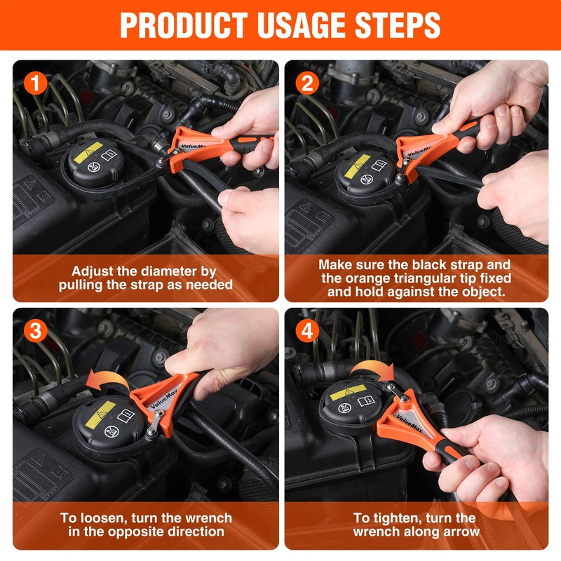 - 【Use Tips】Flexible strap wrench fits any shape and works easily in confined areas. You just need to pull the straps to adjust the diameter as needed. The metal buckle must be applied to the target item tightly. Also, the orange triangle plastic top must fix the black strap to make the rubber wrench work.