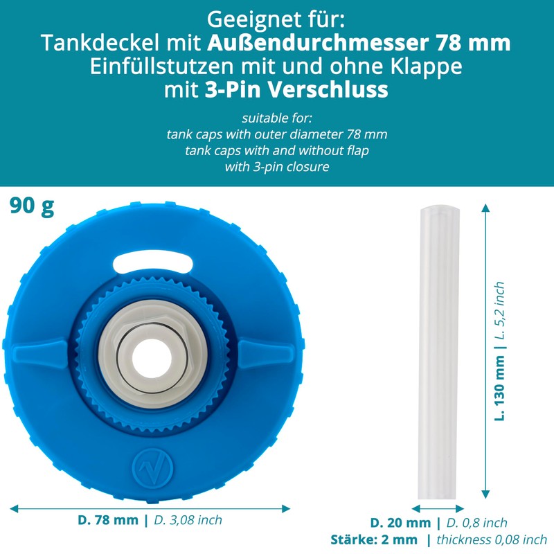- Suitable for 3-pin fuel cap: suitable for fuel caps with an outer diameter of 78 mm and filler neck with and without flap with 3-pin closure. For the water connection on caravan and motorhome (City water connection).
