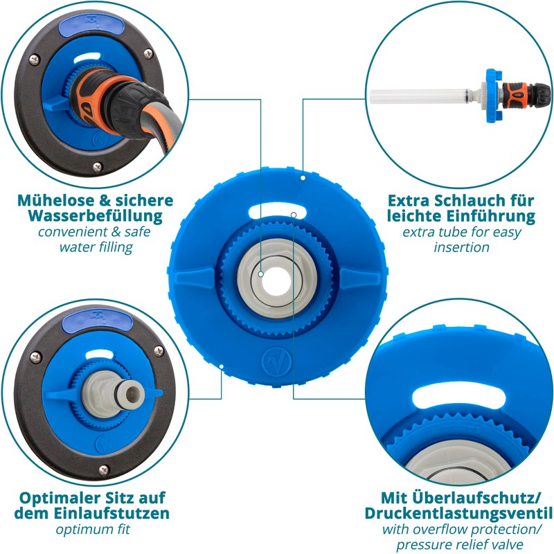 - Practical hose connector: the set contains a functional hose connector that is compatible with the Gardena system. Without manual fixing of the water hose, it stays securely on the water tank cap and can no longer fall out of the filler neck.