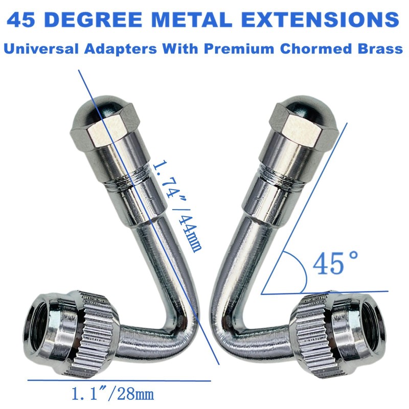 - PACKAGE INCLUDE:4Pieces 45 Degree Valve Stem Extenders.Made of nickle plated brass, with swivel base.